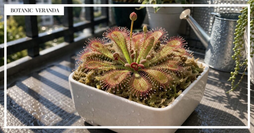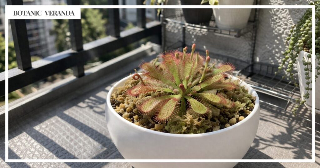 モウセンゴケは明るい場所を好みますが、いつでも強い直射日光が最適とは限りません。特に暑い時期や西日が強い場所では、葉の負担が大きくなって粘液が保ちにくくなることがあります。