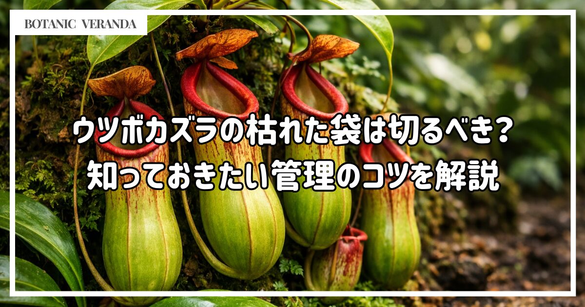 ウツボカズラの枯れた袋は、あわてて大きく切るよりも、まず袋だけが傷んでいるのかを見分けることが大切です。葉が元気なら袋だけを整えればよく、何度も枯れるときは育て方もあわせて見直すと判断しやすくなります。
